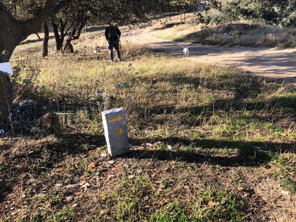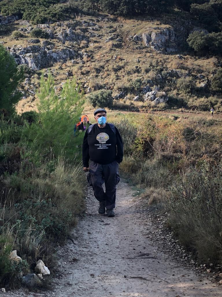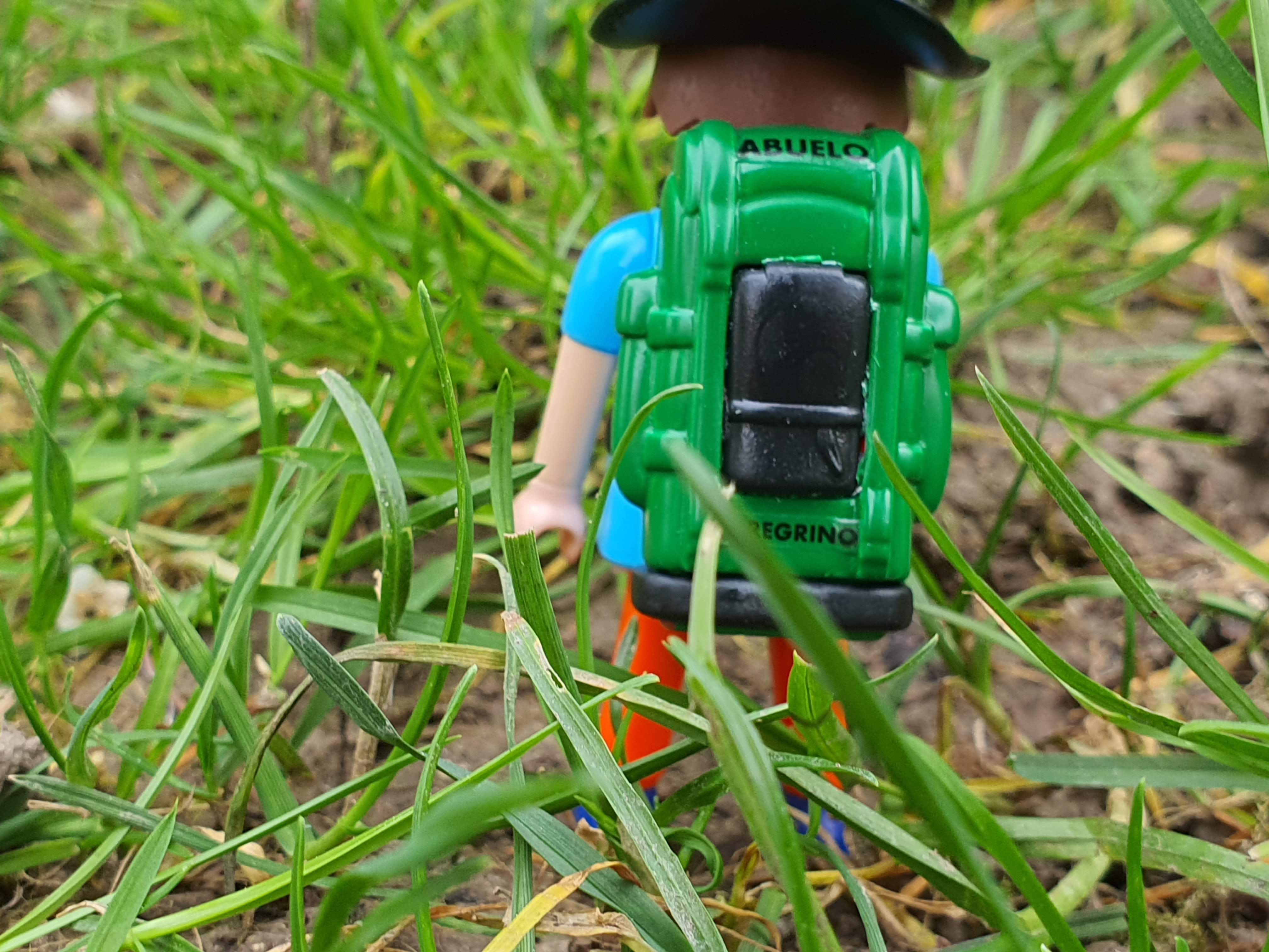 foto, cuando va ya andando de espaldas, leo en la mochila: ABUELO……PEREGRINO.