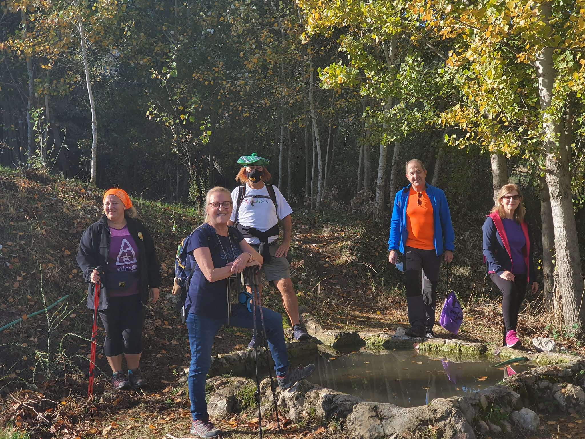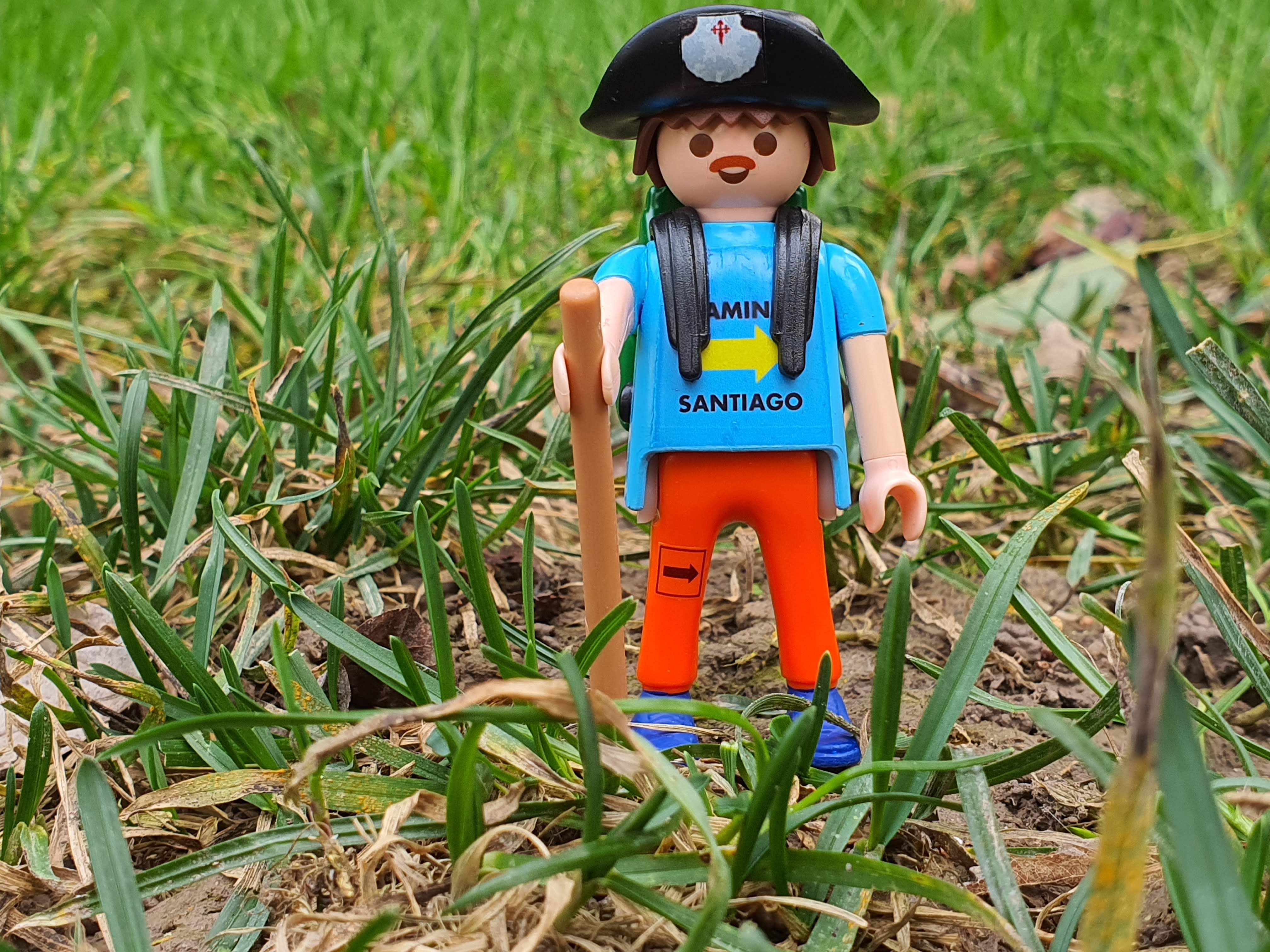 pantalones anaranjados, la mochila verde, su sombrero peregrino incluida
