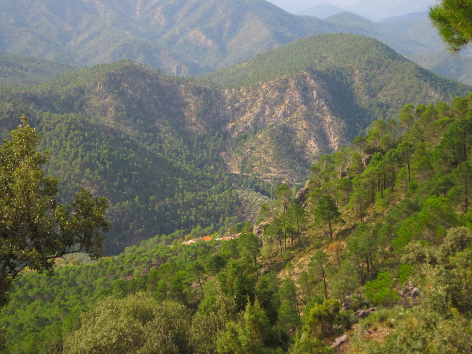 El tiempo apremia y a pesar de que arrecias el paso, una y otra vez te paras porque a cada paso no dejas de tener admiración de cuanto ves. Otra bajada pedregosa te hace mirar mas donde pones el pie que al frente, dejando este camino, aparece un sendero que sirve de atajo para llegar a La Capellania, lugar idóneo para echar un trago, secarse el sudor y contar entre nosotros el paraiso donde vive esta gente, rico en historias y en vida y también en fatigas para poder sobrevivir en estas tierras que en el invierno debe ser durisimo. Abandonamos la aldea por un senderillo que se nos hace mas empinado hacia abajo, hay que echar el freno, está algo escurridizo, la virginidad de este sendero es latente, llevo mas de dos horas observando que al pino laricio o al pino carrasco no paran de unirsele encinas en su mayoria y quejigos, y por allí aparece el enebro, por el otro lado majuelos y al pie de la senda la fragancia del monte bajo, el romero, bosque Mediterráneo, vergel de vegetacion y para rematar la faena el ronroneo de un arroyuelo.