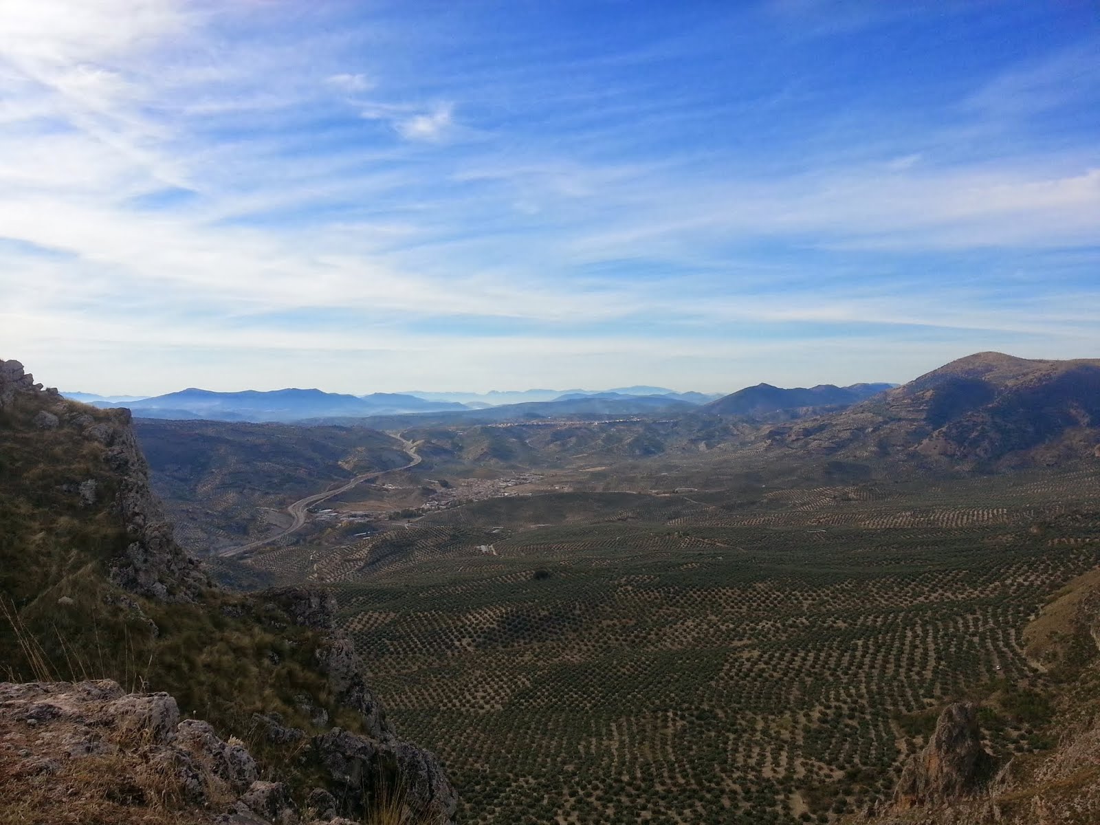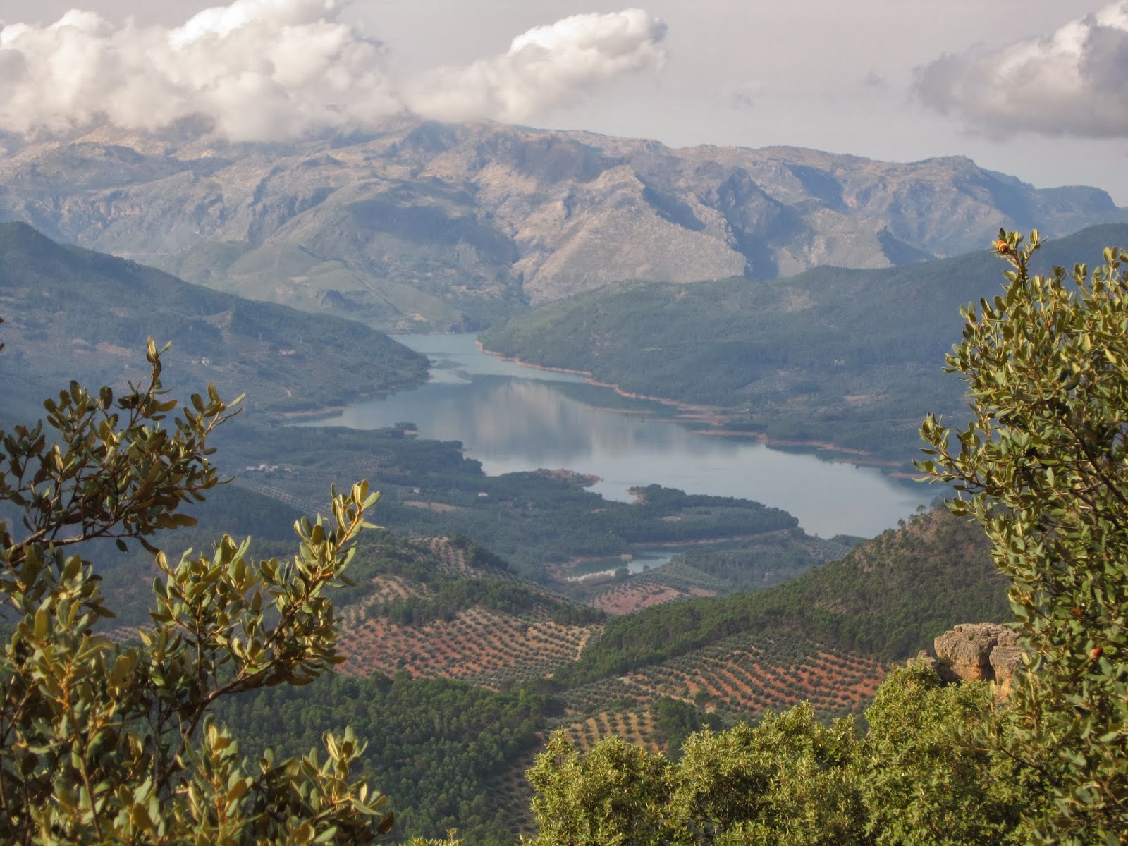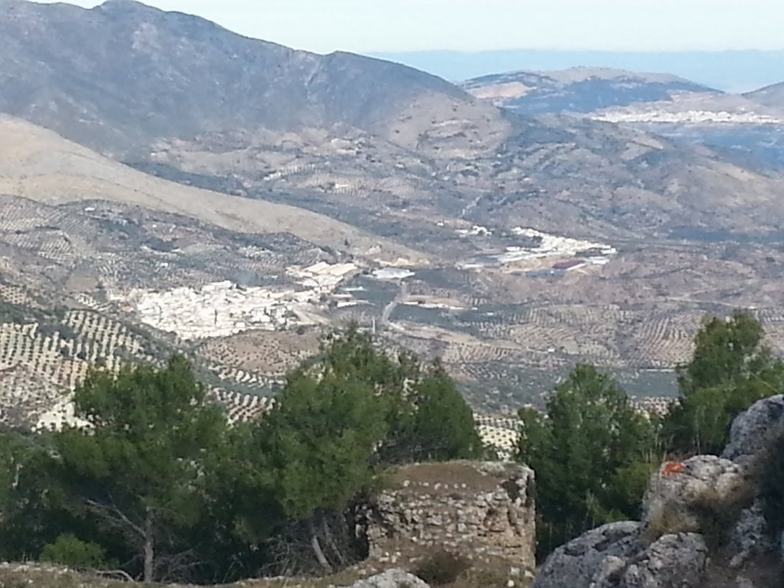 Una vez sosegado el estómago y algo el espíritu nos adentramos en un camino mas ancho, camino de los de rodar vehiculos y en la antigüedad bestias que acarreaban afanosamente aquellos troncos, primero para barcos y últimamente para traviesas de tren, camino también con unas panorámicas mágicas a un lado, porque siempre al otro, al derecho, El Yelmo Chico es el que nos acompaña en todo momento, y entre pequeñas subidas y bajadas mas prolongadas, aparece en el horizonte el Guadalquivir manso, como cansado, nunca mejor dicho "apantado", la imagen no tiene precio, el coste del cansancio para llegar hasta aquí está sobradamente remunerado, pero hay que seguir y a escasos metros, otra vista sin igual, alzado y encaramado en un peñasco aparece Hornos, con su Castillo.