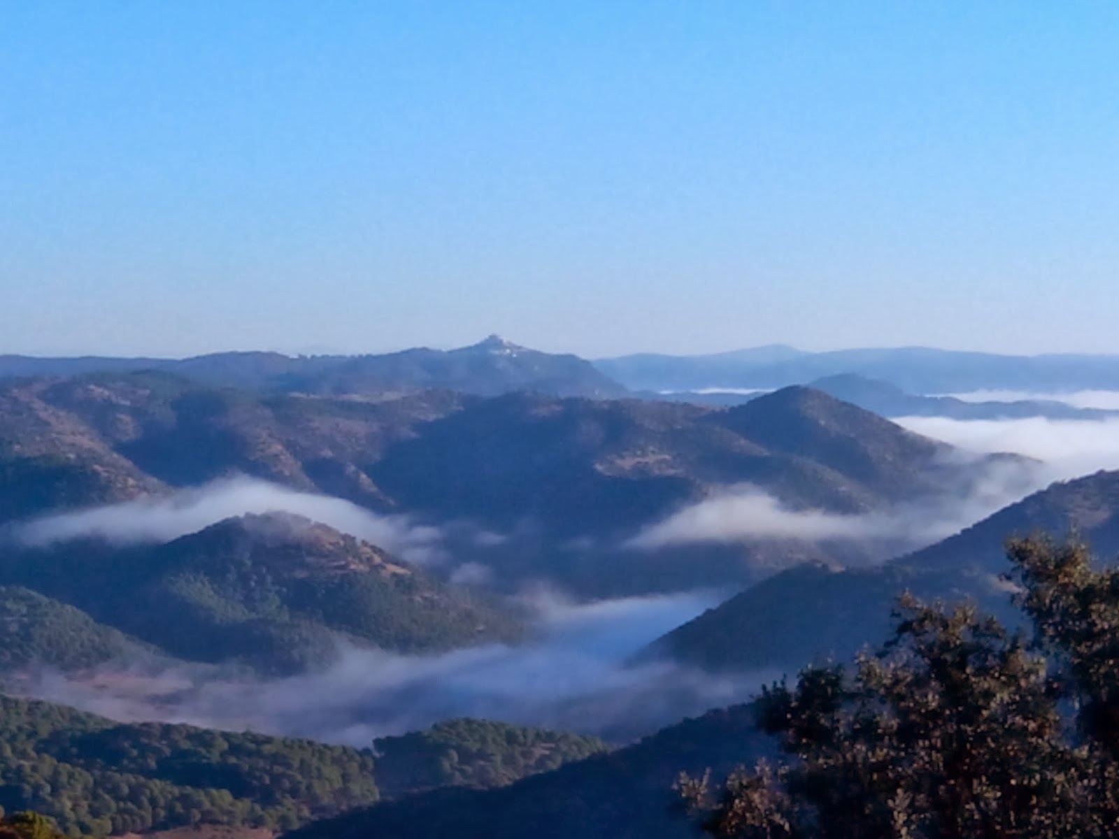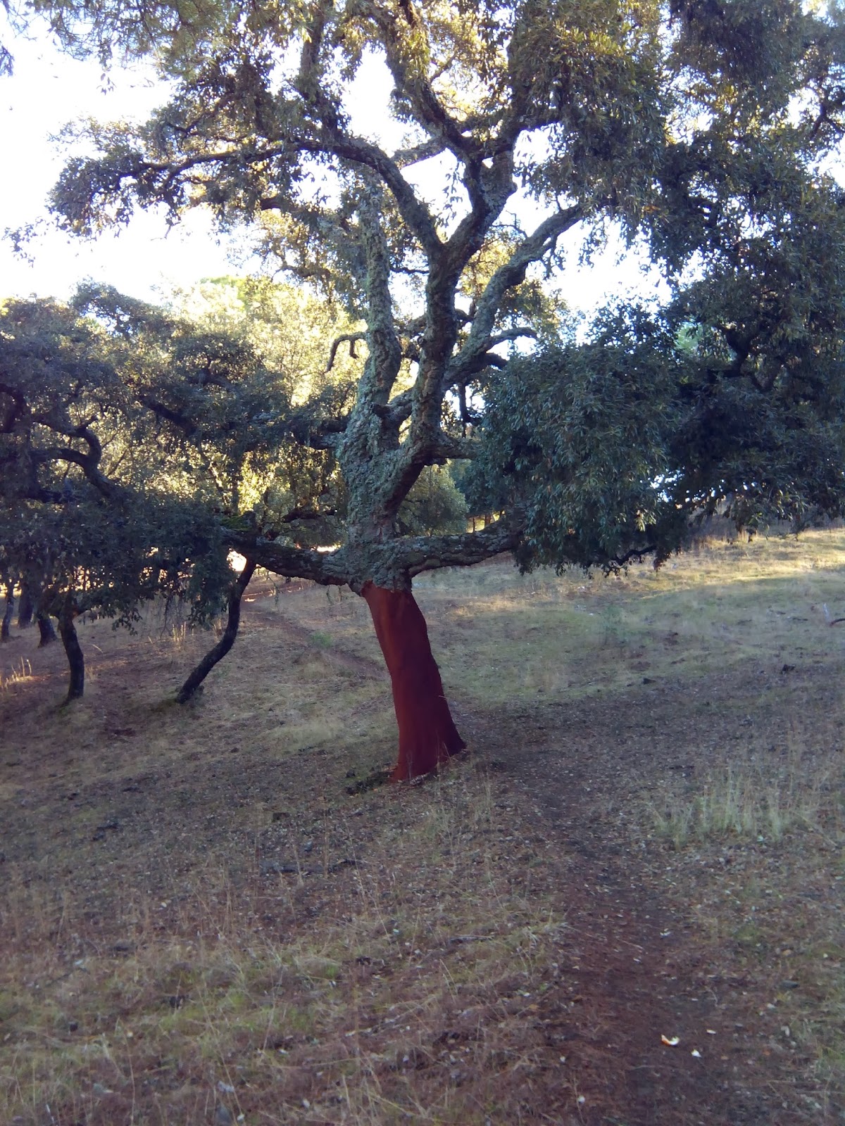 Tras unos tragos reemprendo la marcha e intento apremiar el tiempo perdido, pero........., aqui en estos caminos nunca se debe tener prisa, saltan a la vista los alcornoques, los de esta parte del camino algo mas mayores distinguidos por el color de su tronco, parecen sangrar, y es que este verano habrán pasado por aqui los responsables para arrancar el corcho con sumo cuidado, de forma manual, ayudados por bestias como siempre se ha hecho. Y en la bajada vuelvo a encontrarme en la lejania el fin de mis pasos, con algo muy especial, hoy la naturaleza no me deja ver el rio Jándula por la intensa niebla que se apoya en el y sin embargo si observo el Cerro con su Santuario presidiendo, parecen emerger como diciéndome que si, que está allí, que me espera.