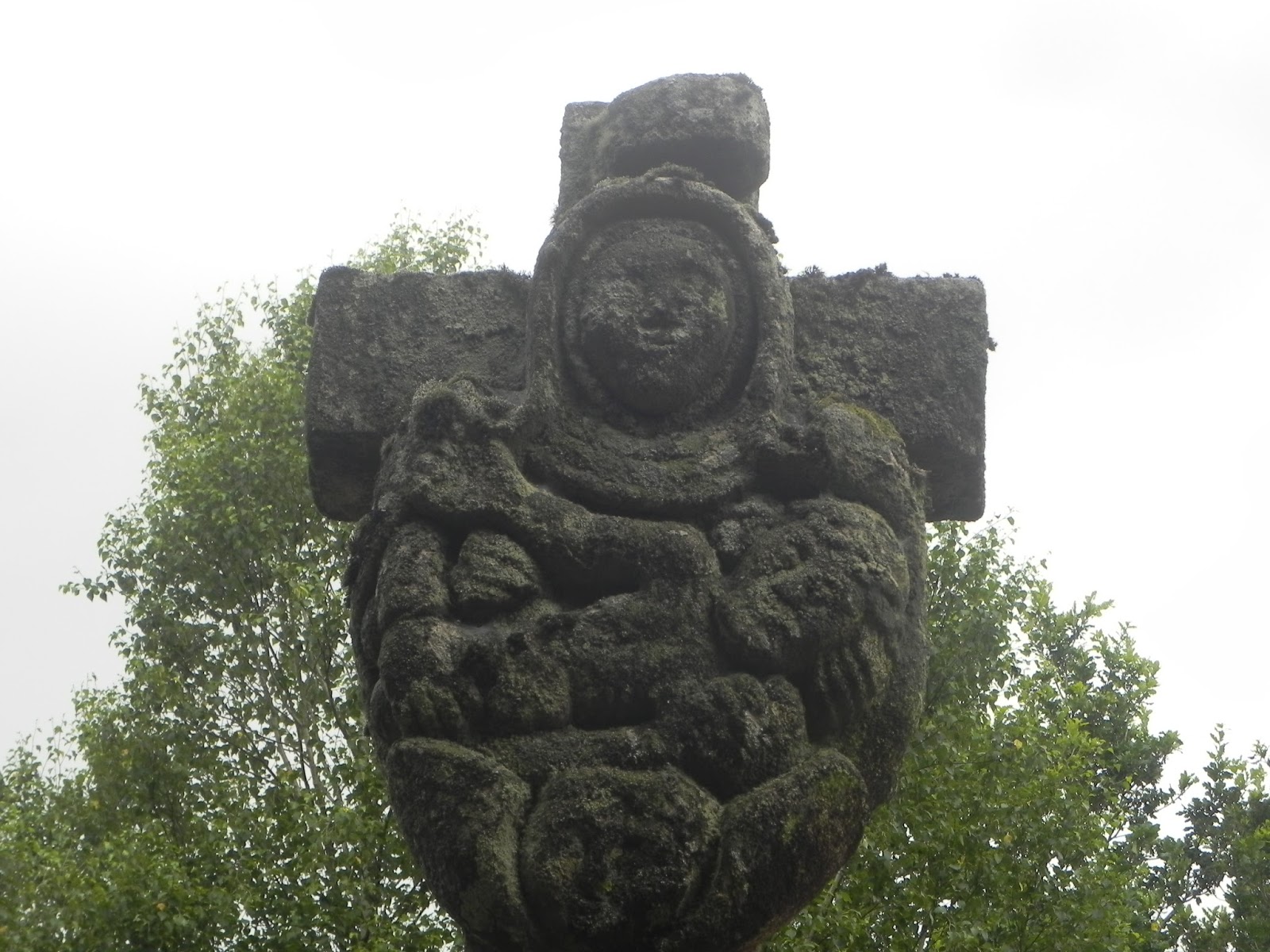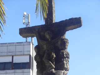 Paso Gónzar donde sello, después Castromaior y tras cruzar caprichosamente una carretera varias veces acabamos en otra mas estrecha seguimos hacia Ventas de Narón. No es el de hoy el camino tan espectacular con su naturaleza como el de ayer, pero si sorprende en Ventas de Narón su pequeña capilla, donde también sello y mas adelante no dejo de recordar y pensar en el cruceiro que mas me ha impactado de todos los vistos, el Cruceiro de Lameiros. Da hasta miedo, la muerte rodea todo el cruceiro, escalera, tenazas, martillo, huesos, craneo, expresión pura de muerte, alli me detengo, lo observo, le doy la vuelta, es aqui uno de esos momentos del camino donde el silencio interior se hace sombrio, junto a el un enorme roble da sombra al Cruceiro, observo a varios peregrinos rodear el roble, abrazarlo, intentan coger energia del suelo, de las raices de la naturaleza.