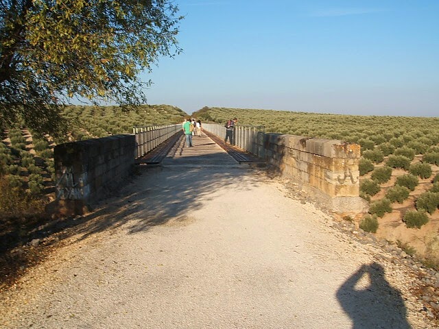 Ensimismado aparece un cruce extraño, me cruzo con la Via Verde del Aceite, la flecha me indica al frente, la cruzo y me adentro en un camino que poco a poco deja de ser tan andaluz, el murmullo de un arroyo, el cañaveral y un sendero de ensueño me dan a entender que la magia del camino me ha llevado a otro lugar, asi de repente, a mi izquierda observo desde mi sendero un gran puente de hierro y en otro cruce mas abajo giro a la izquierda, segun la flecha, y me encuentro con un arroyo, algo bravio, pero no peligroso, hay que cruzarlo, en dos o tres zancadas lo cruzo, asi lo hago y ¡¡ como no !! me mojo, vuelvo la vista atrás y me rio, es ahora cuando empiezo a subir despues de 4 o 5 kilometros la pequeña cuesta, es bonito el panorama, no muy lejos en una loma observo que se desperezan unos pájaros grandes, entre paso y paso termino la subida y las indicaciones, ahora si, me indican que me incorpore a la Via Verde.