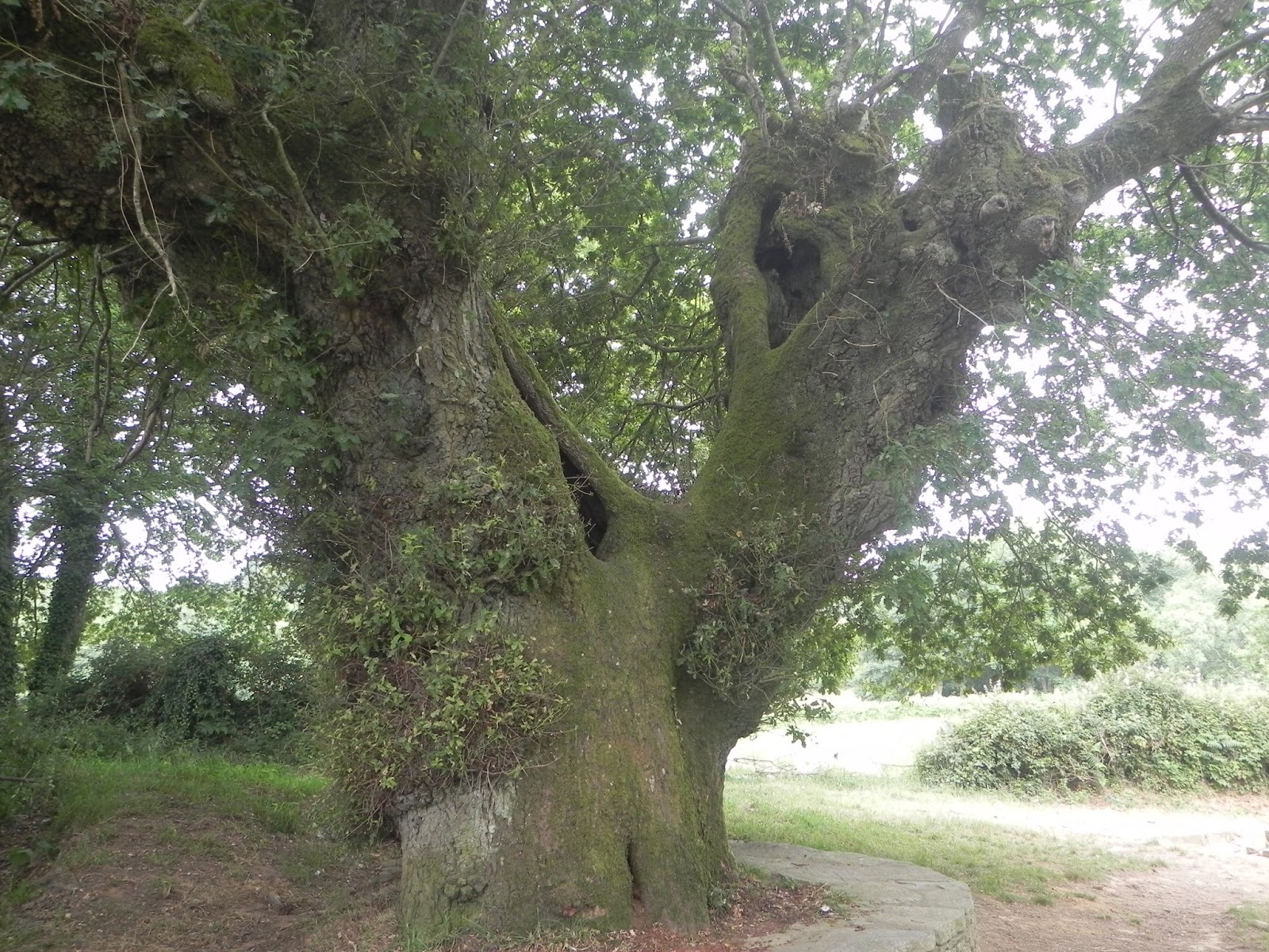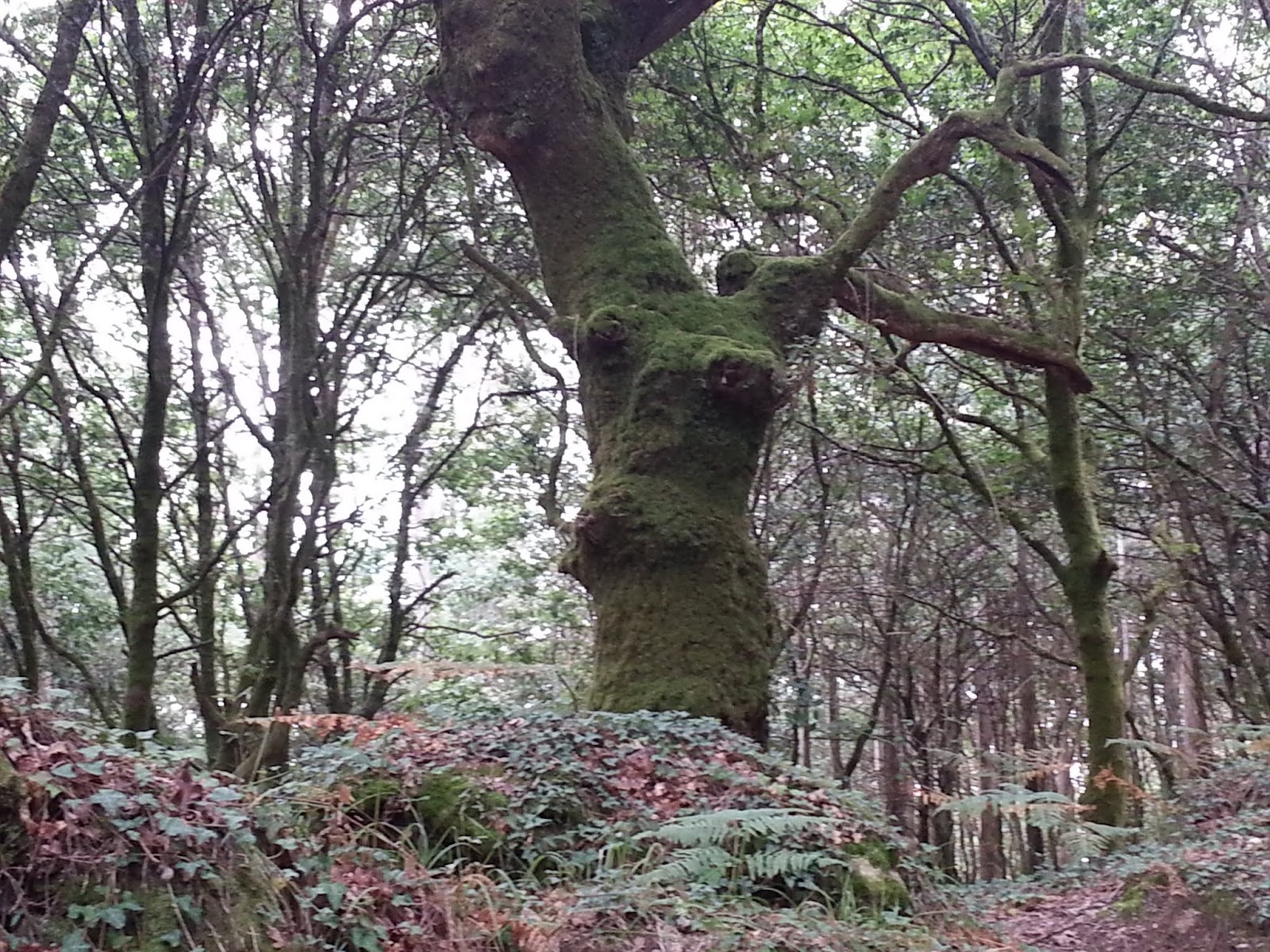 Cuesta abajo, algo empinada, junto al cementerio y primera sorpresa al girar el camino, Ponte Aspera, un antíquisimo puente que puede ser el inicio de un sendero dominado por lo fantástico, atravieso y sigo sin saber que encontraré, avanzo paso a paso, un primer trámite cruzar la via del tren y a continuación la senda empieza a cerrarse, prados y mas campos de maiz se van cerrando y sin darte cuenta entras en un sombrío silencio del camino, nada mas pasar unos tablones pequeños de madera, para no molestar un arroyuelo, te encuentras con la virginidad del camino, altivos robles, marcados algunos por su edad, algunos de estos robles con orificios donde puede caber mas de una persona, es una buena cuesta hacia arriba, te tienes que parar, pero no por la subida, es el espectáculo tan natural y mágico que tienes ante ti, paisaje bravo y silencioso, bosque frondoso de Meigas, ensimismado asciendes, este es unos de esos lugares donde reivindicas tu soledad, una última parada antes de finalizar, amilano la sed con un buen trago de agua, echo la vista atrás y no paro de sorprenderme de lo que veo, lugar para ir sin prisa, sitio que te deja huella, subida fatigosa donde la vegetación roza lo animado.