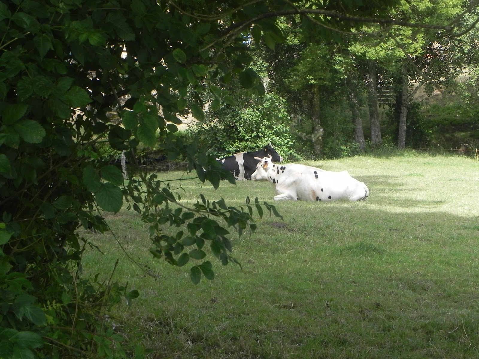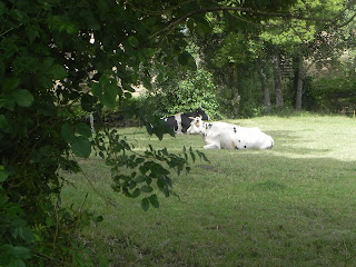 Durante unos instantes no he percibido que es de dia, que el Sol anda en todo lo alto, ha sido la zona tan sombría que los robles con sus poderosas ramas y hojas cerraban cualquier atisbo de luz exterior, he estado tan absorto que ahora al llanear me sorprende como luce "San Lorenzo" desde ahi arriba, es mas, incluso me molesta la luz. No dejo de pensar en el sitio, hasta me dan ganas de bajar y volver a subir, de saborear tan extraordinario paraje. Zigzaguea el camino, el sendero vira y gira entre prados y de nuevo mas maiz, no muy lejos aparece una aldea, vuelta a la civilización, albergue, casas, establos, busco la iglesia de Barbadelo, pregunto y me indican que mas adelante.