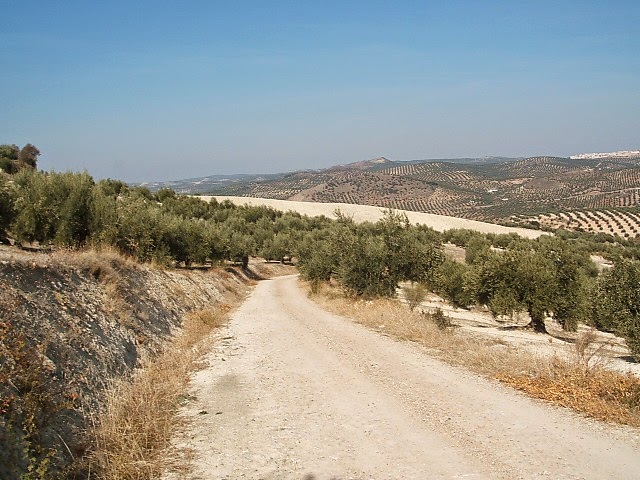 Silencio, soledad y a la vez compañia, todo revuelto, esa es la magia del camino, un cruce me indica a traves de una flecha que hay que desviarse a la izquierda, asi lo hago y empiezo una subida que al final se hará larga, pero que merece la pena hacerla, el horizonte se convierte en una estampa interminable de lomas y riscas, todas llenas de olivos y de vez en cuando salpicada con algún cortijo: