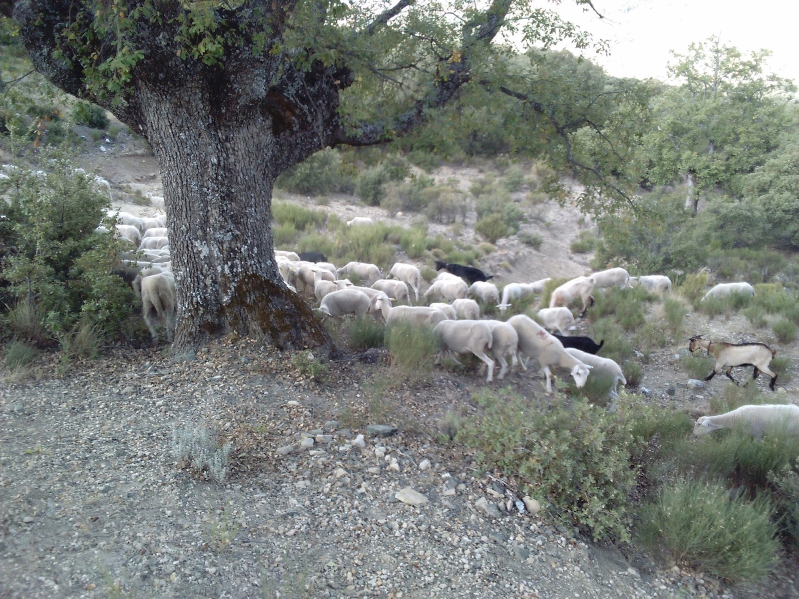 La casquera junto al Castillo pudo dar mas de si, pero ellos volvian y a mi me entró una inmensa gana de tirar para adelante y empaparme de este camino. Mientras ascendia al Puerto de la Mata, observaba la dehesa, los quejigos centenarios e inmensos, las encinas, los enebros, los majuelos, algún arroyuelo y no paraba de recordar todo lo que esos dos hombres me contaron. En cualquier explanada fijaba mi vista por si aparecia un senderillo o una "colá" como ellos argumentaban, sitios por donde poder esconderse. No podia faltar por supuesto el cruzarme con un rebaño de ovejas y de cabras y junto al cabrero echar un breve rato de "parranda", le pregunté por si en esta Sierra habia hierbas curativas, su pregunta no se hizo esperar, ¿Vd. me ha visto alguna vez en el médico?, le respondí que ¡no!, a lo que el asintió: ¡pues yo todo lo arreglo con las hierbas de por aqui!, tras compartir fruta y agua prosigo ascendiendo, esperando en cada curva encontrarme en cualquier momento con una recua de mulos o con grupo de maquis o soldados de un bando u otro defendiendo su territorio. Mientras subes y paras para tomar aire, echas la vista atrás y la estampa no puede dar mas de si, la belleza incomparable, es un lujo esta tierra, el sitio, la paz, las vistas, el sosiego.