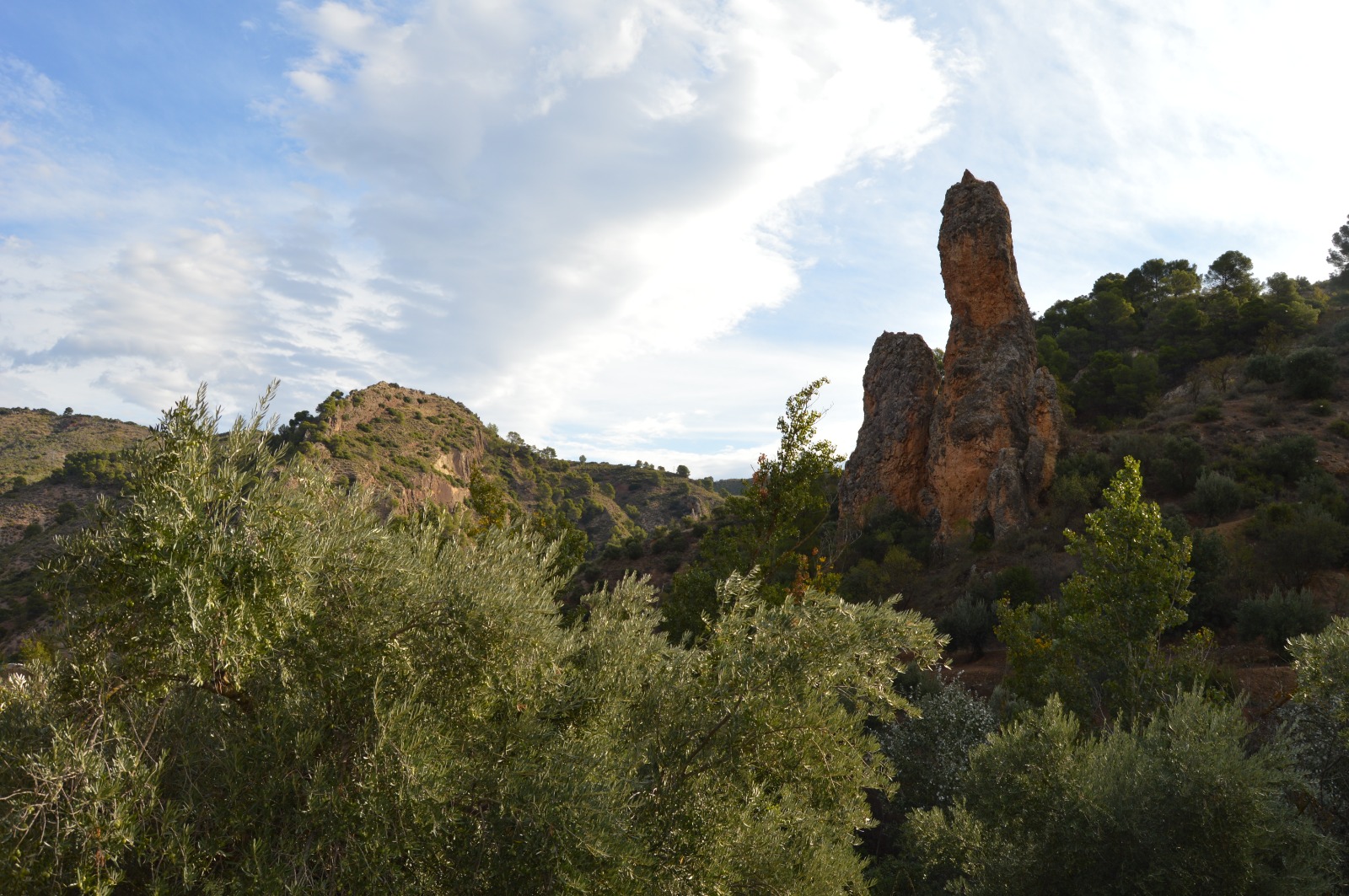 Lo primero que mis ojos ven en el descenso del carril junto a la fábrica de embutidos es el bosque de "olivos", infinito a la vista en algunos tramos del camino, pero me quedo con la PAZ que siento, olivos, tranquilidad, sosiego y alegría de meterme de lleno en este carril que llega a ser en pocos metros un vericueto y enredoso sendero. Me noto que voy saliendo de la rutina diaria, place el sitio, el sendero ahora medio sube, ahora medio baja y me lleva al final a cruzar un arroyo que rompe el silencio con el trasiego del agua, hay espacios de buena vega, granados, membrillos, algún que otro cerezo y olivos, bosque de árbol todavía silencioso y de mucha paz, en menos de una hora veo que se acerca el fin en este primer tramo del camino que me va a llevar a Cambil, me sorprende un peñón raro, desde pequeño cuando pasaba con el coche mis progenitores me decían: ¡¡mira el diente de la vieja!!, jajaja, a buena fé que hoy observándolo tan de cerca si que lo parece.