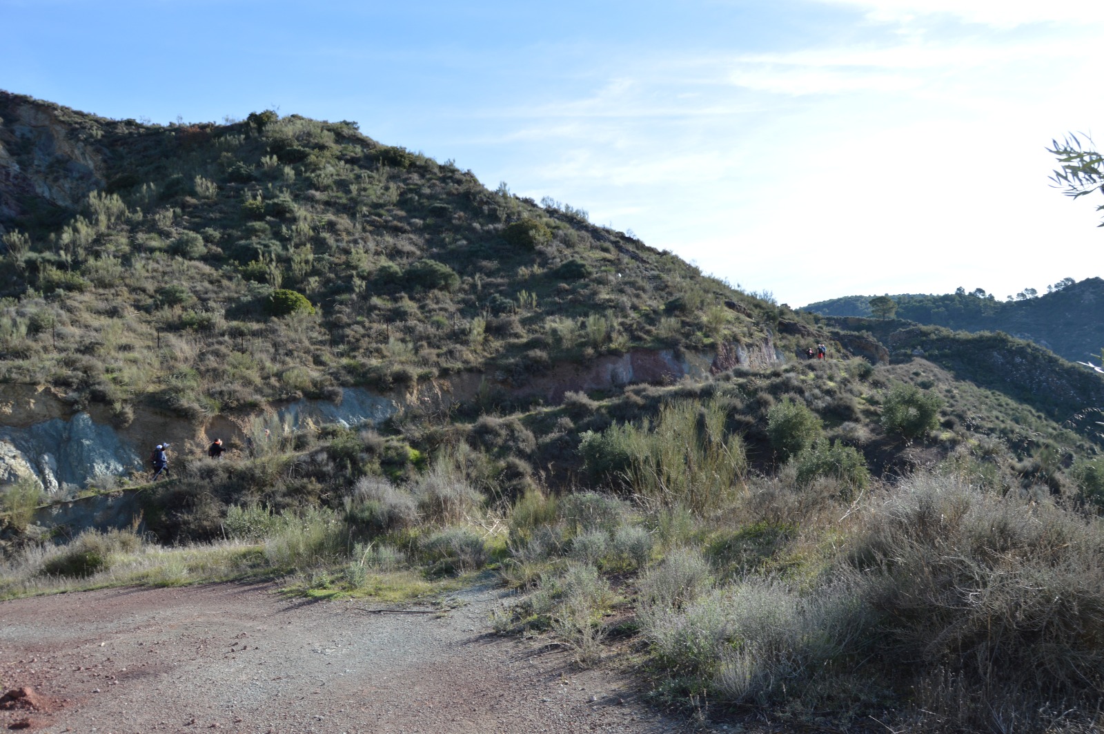 Ahora toca el tramo de asfalto, van a ser pocos metros, quizás un kilómetro, lo suficiente para acelerar el paso y acabarlo pronto, y de nuevo bajo el puente de la autovía un puente pequeño, vuelves al carril primero, mas adelante al sendero y al final de nuevo al carril. Pero ahora el terreno se te hace extraño, he pasado de un lugar que es verde, húmedo y fresco con buenos árboles a un sitio arisco, con bosque muy bajo y matorral y muy seco, parece la antesala de un desierto, por todo esto el territorio no deja de tener su encanto, todo esto me lo encuentro a la izquierda conforme avanzo, a la derecha es otro cantar, no muy lejos el susurro del río Cambil te llama, como diciéndote que está ahí con sus meandros frenando el agua para que no llegue tan pronto a su destino, a la izquierda sequedad, a la derecha, agua, frescura y umbría.