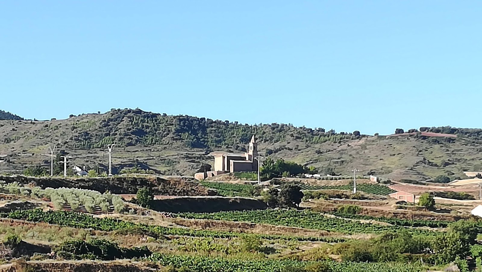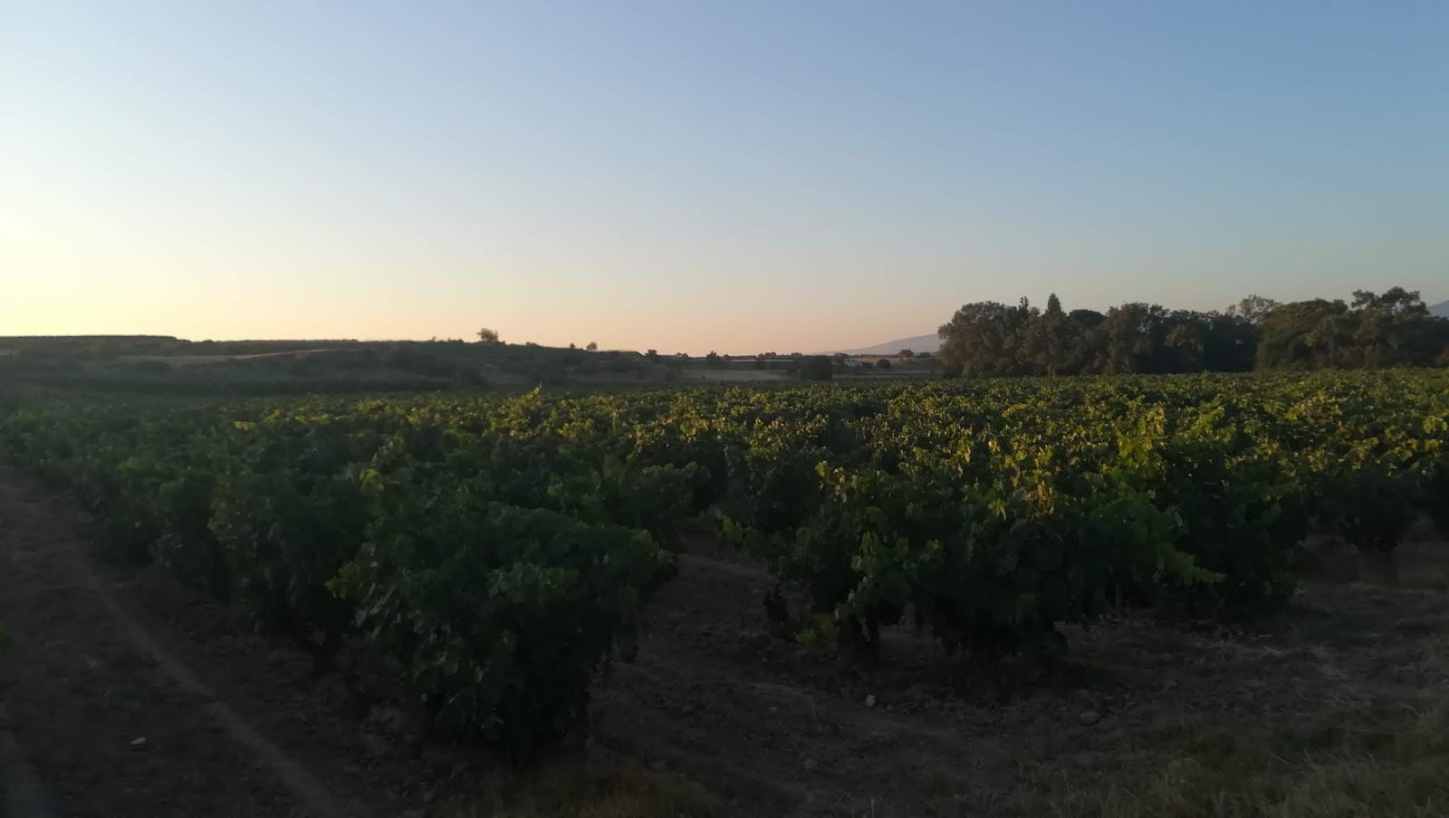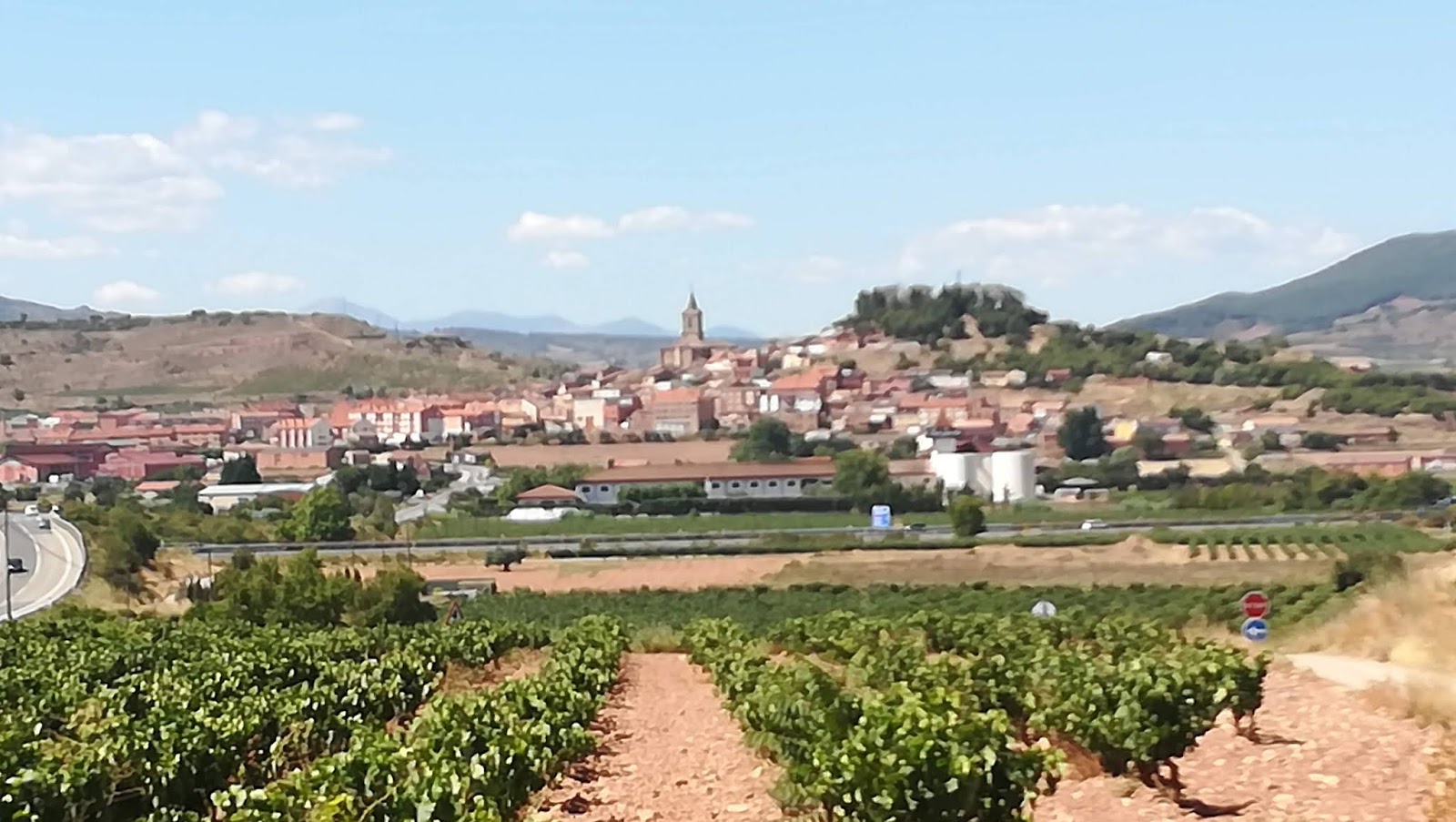 La vida sigue y reanudada la marcha el camino ha tenido el mismo panorama, viñedos por doquier, las únicas sombras del día las hemos descubierto en el Alto de San Antón, poco más mediada la etapa, buenas vistas y más viñedos, fincas y naves productoras de buen vino, por cierto aquí el buen vino cuesta entre 0,80 y 1 euro la copa.