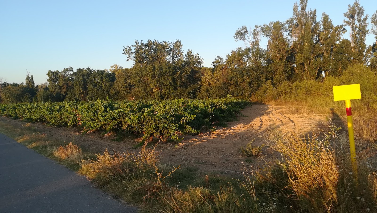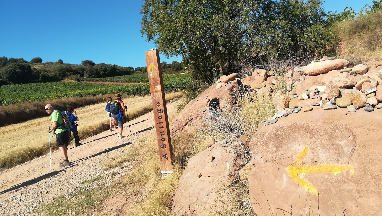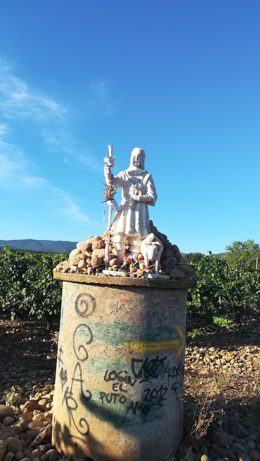 La vida sigue y reanudada la marcha el camino ha tenido el mismo panorama, viñedos por doquier, las únicas sombras del día las hemos descubierto en el Alto de San Antón, poco más mediada la etapa, buenas vistas y más viñedos, fincas y naves productoras de buen vino, por cierto aquí el buen vino cuesta entre 0,80 y 1 euro la copa.